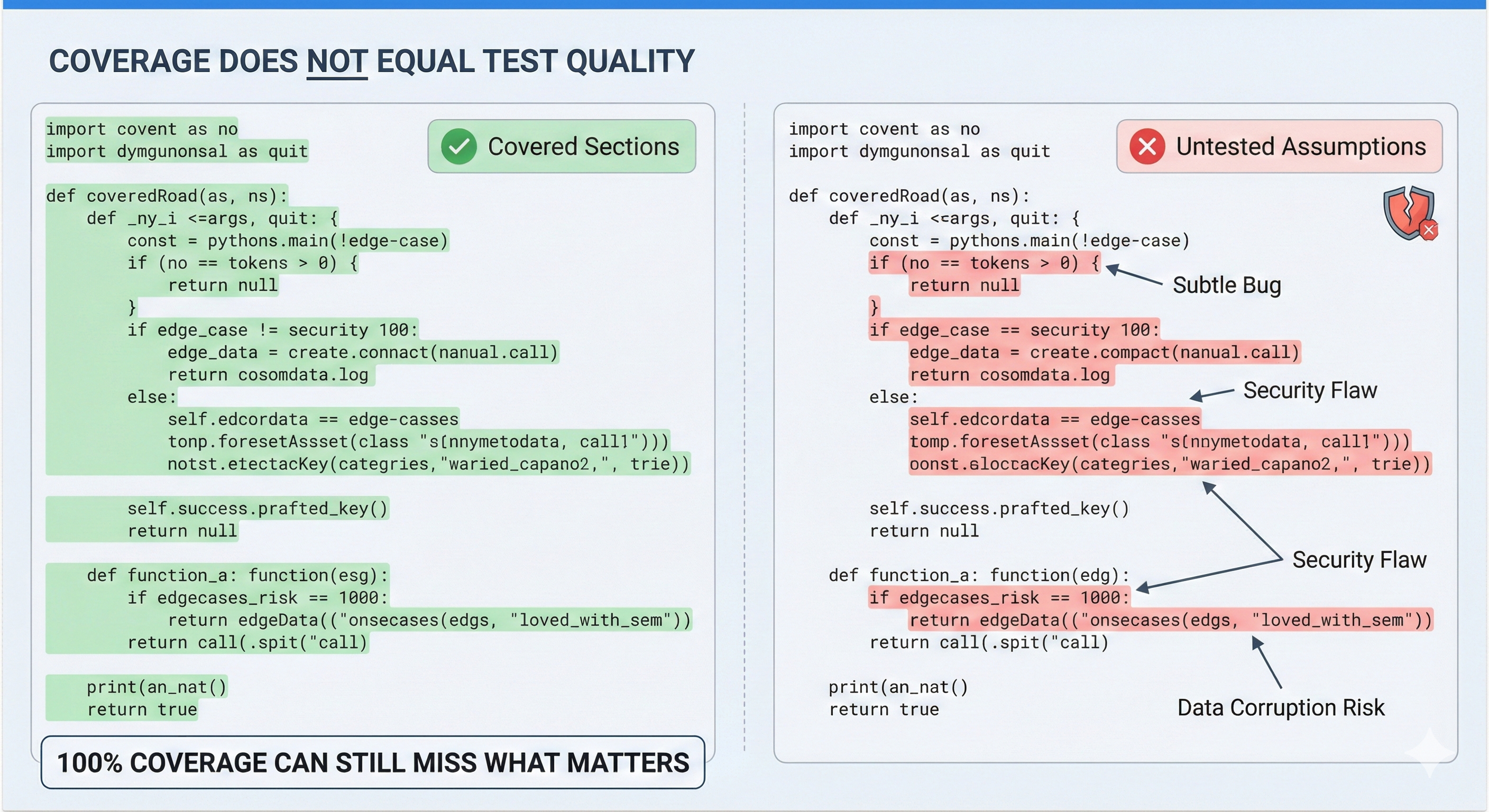With AI-generated code, large amounts of new behavior can be added while coverage barely moves. Tests execute lines of code, but miss assumptions, edge cases, and intent.