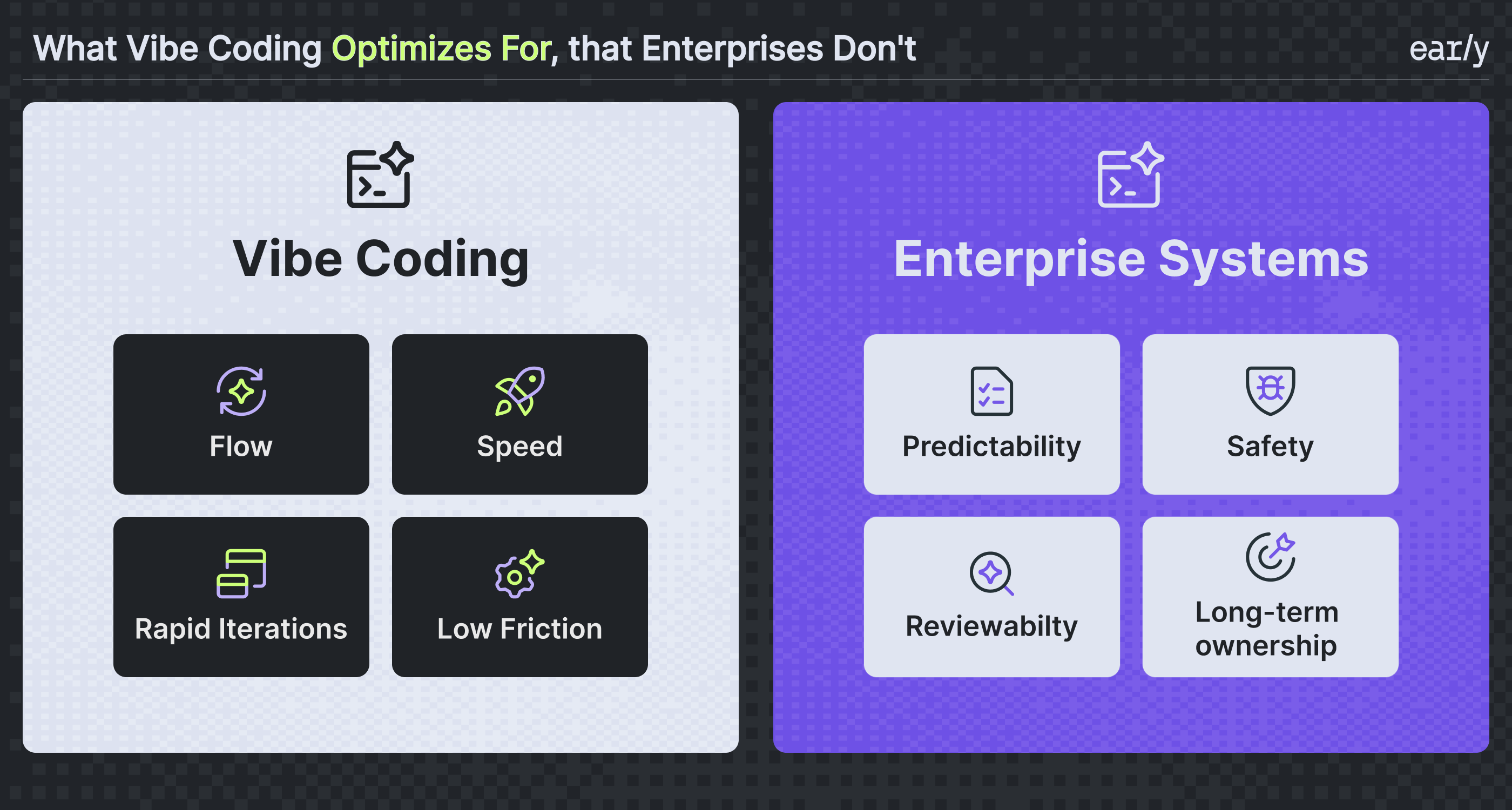 Enterprise software optimizes for safety. Changes need to be understandable, reviewable, and safe to operate over time, often by people who didn’t write the original code.